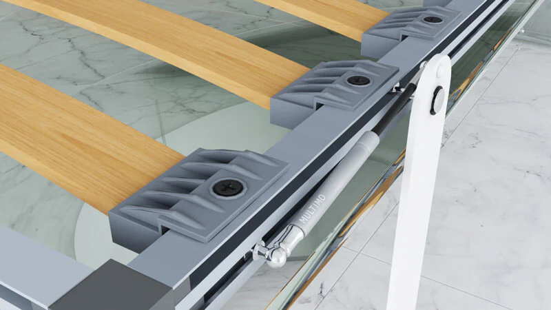 Ein hochmodernes, hydraulisches Gasdruckfeder-System mit einer Hubkraft von 1400 NEWTON auf jeder Seite ermöglicht ein sanftes Öffnen und müheloses Schließen des Wandbetts. Sie können das Bett problemlos mit einer Hand öffnen und schließen.