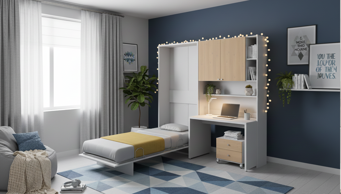 Das vertikale Klappbett "Happy" verwandelt sich mit einem Handgriff vom eleganten Schrank in ein komfortables Einzelbett. Nur ca. 35 cm Tiefe im geschlossenen Zustand – perfekt für Apartments, Gästezimmer oder WG-Zimmer.