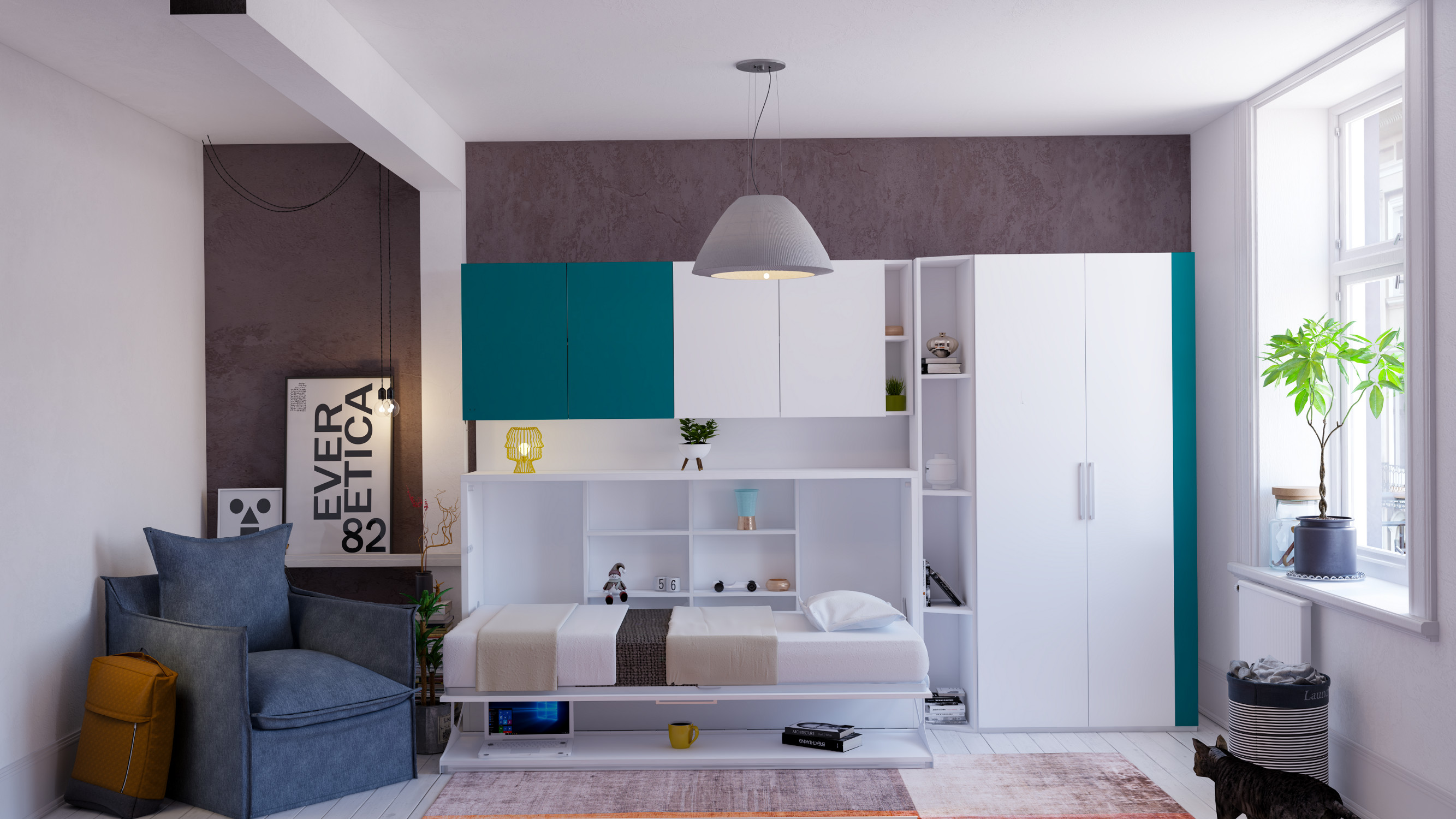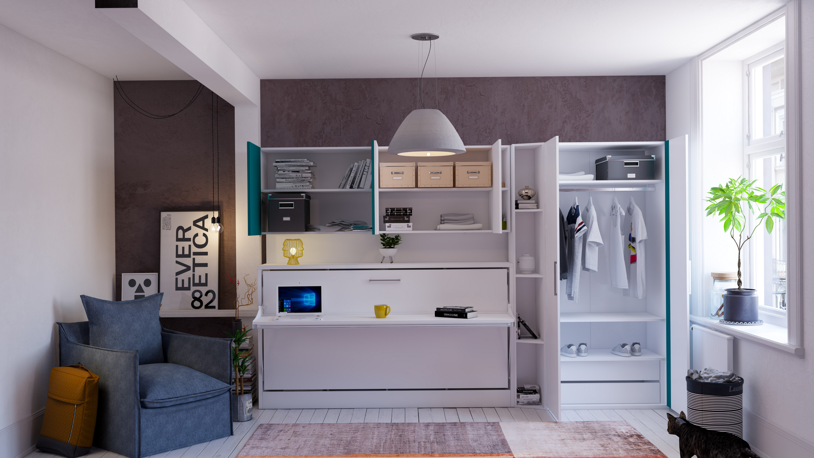 Multifunktionale Ablage: Das herausragende Feature ist die integrierte schwebende Ablage. Diese dient ideal als Präsentationsfläche für Dekorationsartikel oder als kompakter Schreibtisch, wenn das Wandbett eingeklappt ist.